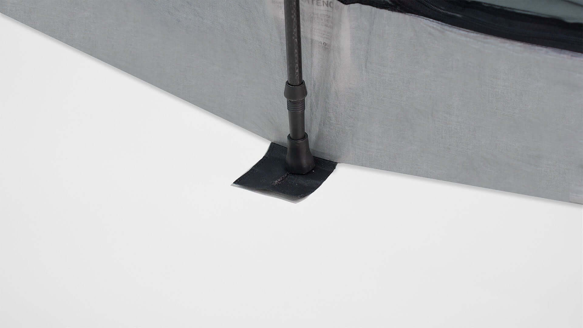 - Die hintere Stange wird in die hintere Ecke geschwenkt, wodurch steile Wände mit viel Kopf- und Fußraum entstehen. Je nach Neigung des Bodens kannst du in beide Richtungen schlafen.